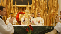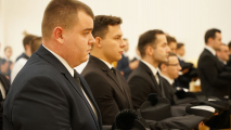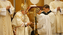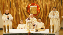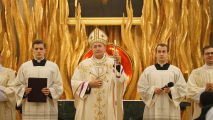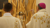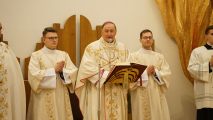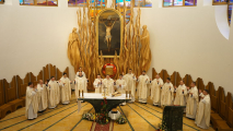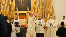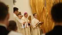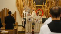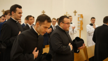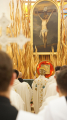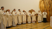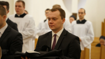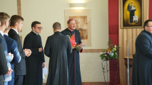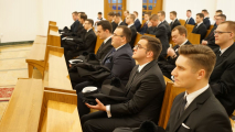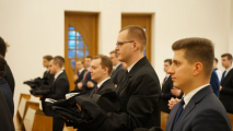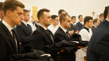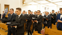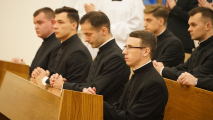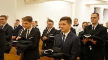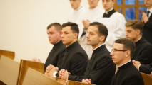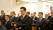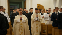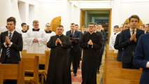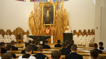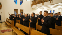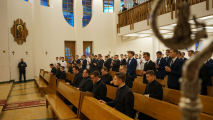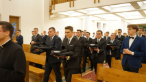 Już od samego rana w niedzielę dało wyczuć się podniosłą atmosferę. Każdy z uśmiechem wchodził do kaplicy. Przed godziną 8:00 do kaplicy weszło 14 Braci w garniturach, których wprowadzili ojciec duchowny Tomasz Rąpała oraz ksiądz prefekt Paweł Lis. Zasiedli w pierwszych ławkach, a na ich dłoniach spoczywały pięknie złożone sutanny. O godzinie 8:00 rozpoczęła się uroczysta Msza św. pod przewodnictwem Biskupa Ordynariusza Andrzeja Jeża – Ojca naszej Wspólnoty. Pasterz naszej diecezji w homilii zaznaczył, że dzisiaj jest czas, aby otworzyć na oścież drzwi naszego życia, aby wpuścić Światłość Świata, którą jest Jezus Chrystus – Król Wszechświata. Nie możemy tylko uchylić drzwi, przez które będą wchodzić jedynie małe promienie.